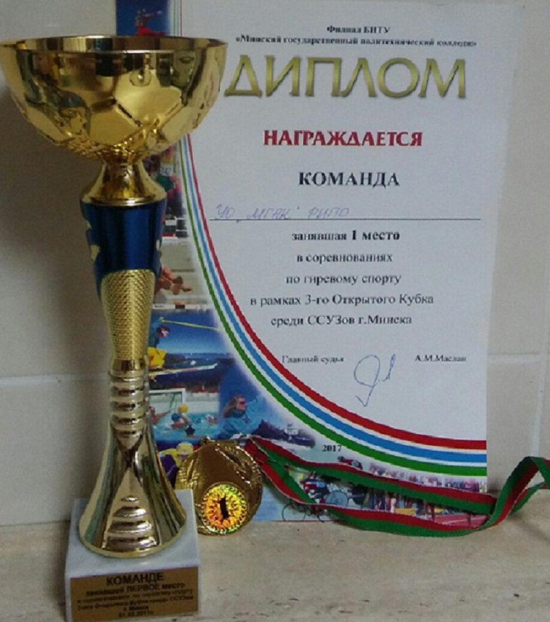 27 ноября команда учащихся нашего колледжа приняла участие в районных соревнованиях по гиревому спорту. Соревнования проводились в четырех весовых категориях по рывку гири весом 16 кг. Всего участвовало 5 команд: БГАА, УГЗ МЧС, РГСУ, МГАК и БГЭУ. Мы заняли 2 место. За нашу команду выступали: Хилько Владислав 2РА-1, Витковский Алексей 2РТ-1, Бертош Ярослав 2ЭС-1, Сергейчик Кирилл 2РА-1, Мазалевский Михаил 2ОС-1.