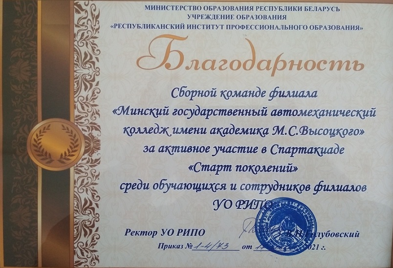 Данные учащиеся войдут в состав сборной команды колледжа для участия в открытом военно-спортивном празднике, посвященном Дню Защитника Отечества и Вооруженных Сил Республики Беларусь, который пройдет 02.03 на спортивной базе филиала БНТУ "Минский государственный машиностроительный колледж".