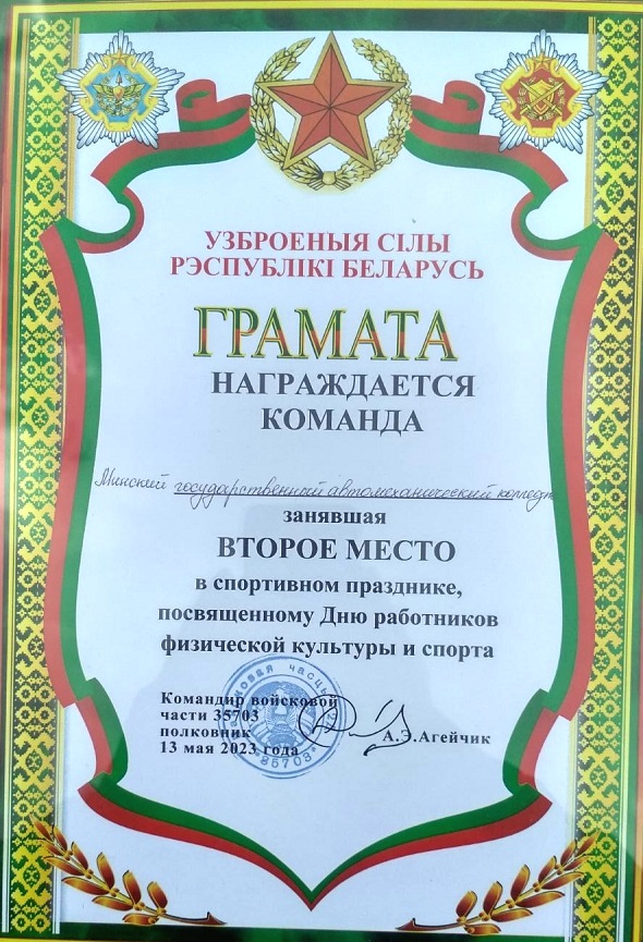 02.03.2016 на базе машиностроительного колледжа прошел военно-спортивный праздник, посвященный Дню защитника Отечества и ВС РБ. Программа праздника состояла из комбинированной эстафеты, силовых упражнений: борьба на руках (армрестлинг), перетягивание каната и поднятие двух гирь. Сборная команда МГАК впервые принимала участие в таких соревнованиях.