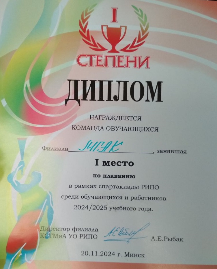 Очередной этап Спартакиады УО РИПО «Старт поколений» прошел 20 ноября 2024 года. В соревнованиях по плаванию среди учащихся наши пловцы в пятый раз подряд завоевали 1 место. Нашу команду представляли учащиеся: Клишевич Виталий (3ГП-28), Дудинский Вадим (4ЭА-112), Ребковец Илья (3АС-47), Левицкий Даниил (3А-34), Букатый Глеб (2РТ-1), Миханько Дмитрий (2ОС-1), Галабурда Константин (1ПТ-3), Груша Арсений (1РТ-4) и Коростелев Артур (1ПТ-3). В итоговом протоколе команды учащихся расположились в следующем порядке: МГАК ‑ 2098 очков, ГГДСК ‑ 1944, КСТМиА ‑ 1672, ИПК ‑ 1461 и МГПК ‑ 1384.